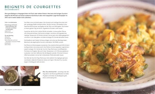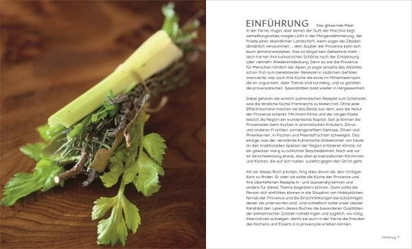 Die großformatigen Fotos laden dabei zu einer Gedankenreise durch die Provence ein. Der Leser entdeckt die malerische Küstenregion mit schaukelnden Fischerbooten und das bergige Hinterland mit seinen Schafsherden. Die bunten Zutaten machen Lust, selbst zu kochen und alle Küchentricks selbst auszuprobieren, die teils in Schritt-für-SchrittAnleitungen zeigen, wie man das Beste aus einer Zutat herausholen kann. Zusätzlich finden sich viele spannende Hintergrundinformationen zur Region und deren Besonderheiten. Die französische Küche erscheint oft als kompliziert und nicht für den Hausgebrauch geeignet. Mit diesem Mythos räumt das Kochbuch auf und zeigt, wie einfach und aromatisch die Küche Südfrankreichs ist, und, dass sie auch von Kochanfängern ohne Probleme gemeistert werden kann.