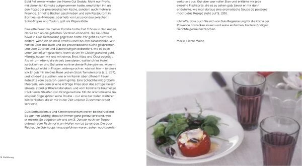 Über die Autoren: Marie-Pierre Moine war Redakteurin für das Taste Magazine und schrieb über sechzehn Jahre für die Food Kolumne bei House and Garden. Sie verbrachte Ihre Kindheit in Paris, im Loire Tal und in der Provence. Gui Gedda ist Chefkoch und über die Grenzen Frankreichs als Papst der provenzalischen Küche bekannt. Seine Rezepte werden teils seit Generationen in der Familie weitergegeben. Die Zutaten für seine Gerichte kauft er frisch vom Markt und entdeckt so die besten Köstlichkeiten