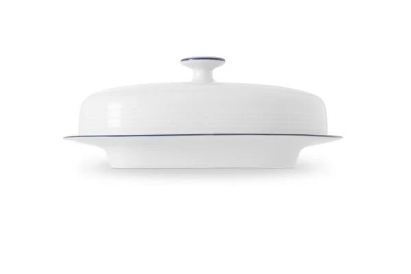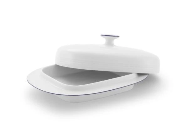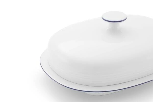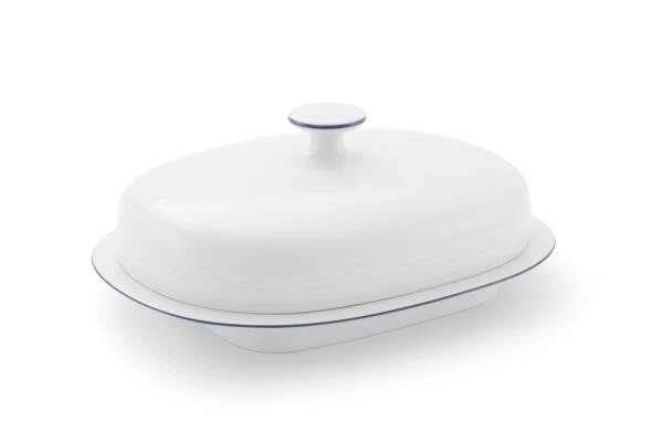 Butterdose JEVERLAND Kleine Brise für 250 Gramm Butter. Zeitlose Butterdose aus hochwertigem Porzellan in weiß mit blauem Zierstreifen.