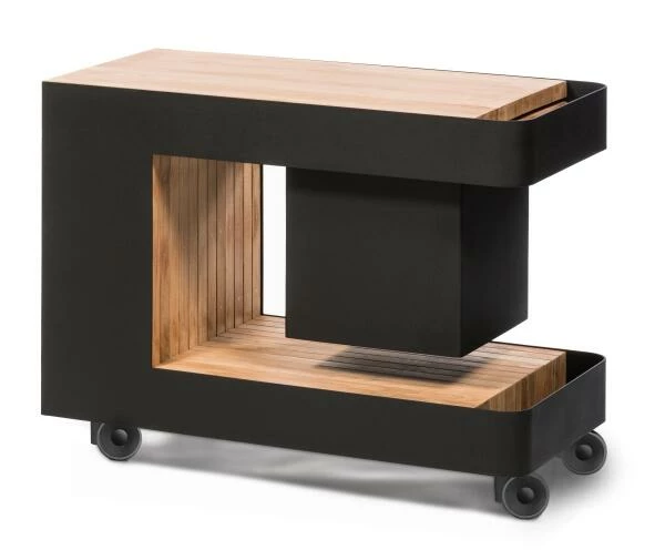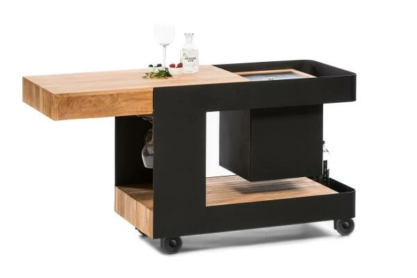 indu+ Servierwagen IceBoy mit Kühlbox. Mobile Bar und eleganter Beistelltisch in einem. Zum stilvollen Servieren und Aufbewahren von gekühlten Getränken. Hergestellt aus hochwertigem Teakholz, kombiniert mit pulverbeschichtetem Aluminium.