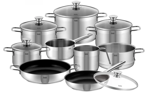 Silit Topfset Pisa, 10-teilig. Bestehend aus einem Bratentopf, drei Fleischtöpfen und Bratpfanne mit Glasdeckel, Stielkasserolle, Milchtopf, Dämpfeinsatz und einer beschichteten Servierpfanne.