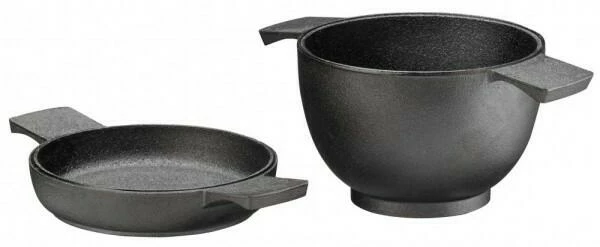 Gusseisen. Ideal zum Portionieren und Servieren am Tisch. Inklusive Deckel, der als Ofenform oder Pfanne verwendet werden kann.