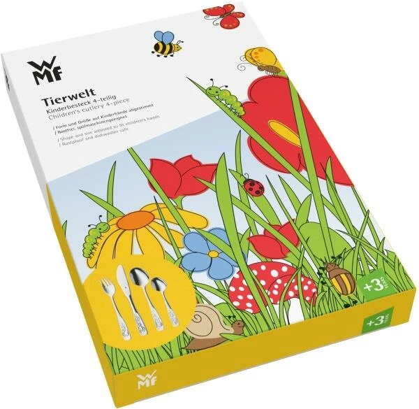Mit dem Kinderbesteck von WMF lernen die Kleinen spielerisch, mit Messer, Löffel und Gabel umzugehen. Mehr als 125 Jahre Erfahrung stecken in den kindgerechten Besteckteilen aus rostfreiem Edelstahl, die außerdem mit liebevoll gestalteten Motiven und farbigen Bildern begeistern. Das 4-teilige WMF Kinderbesteck, bestehend aus einem Kindermesser, einem großen und kleinen Kinderlöffel sowie einer Kindergabel, zeichnet sich durch ein kindgerechtes Design aus, das die Fähigkeit zum selbständigen Essen verbessert und gleichzeitig für Spaß beim täglichen Essen sorgt. Die Kinderbesteckset sind in entsprechende Altergruppen eingestuft, dieses eignet sich für Kinder ab 3 Jahren. Die Größe und Form dieser Kinderbesteckteile machen dieses Set zum perfekten Erstbesteck für absolute Sicherheit und die Entwicklung der Feinmotorik. Die Größen der Besteckteile und die kräftigen Stiele eignen sich besonders für kleine Hände und die kindliche Motorik. Die Messer haben einen leichten Wellenschliff. Der Laffenrand des Löffels hat abgerundete Kanten, und die kurzen stumpfen Zinken der Kindergabel passen sich kleinen Kindermündern an. Die Besteckteile aus Cromargan Edelstahl Rostfrei 18/10 sind langlebig und können in der Spülmaschine gereinigt werden. Spülmaschinenfestes und säurebeständiges Cromargan garantiert vollen Geschmack, außergewöhnliche Haltbarkeit und eine elegante Ästhetik. Das 4-teilige Kinderbesteck wird in einer hochwertigen Faltschachtel mit Klappdeckel geliefert.