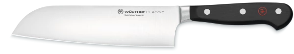 Santoku Classic, glatte Klinge. Speziell entwickelt für die Zubereitung von Sushi und Sashimi – ideal aber auch für feinste Schneidarbeiten in der Küche. Was für europäische Küchen das Kochmesser, das ist in Japan bzw. ganz Asien das Santoku. Es ist von Form, Gewicht und Schliff so vielseitig, dass es sowohl beim Wiegen und Hacken von Kräutern, Gemüse und Obst Anwendung findet als auch bei der Vorbereitung von Fisch und Fleisch. Die scharfe Klinge eines Santoku erlaubt feine bis hauchdünne Schnitte und ist damit aus Küchen in der ganzen Welt nicht mehr wegzudenken.
