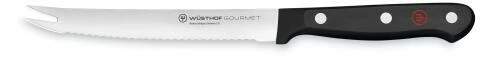 Wüsthof Tomatenmesser Gourmet. Der feine Wellenschliff schneidet glatt durch die feste Tomatenhaut und ist daher auch für Käse und Früchte geeignet. Die gegabelte Spitze des Messers ist geeignet, um kleine Scheiben der Zutat aufzunehmen.